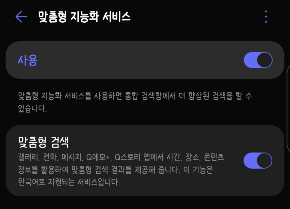 먼저 '맞춤형 검색' 기능은 주로 갤러리 앱 등에서 시간대별로 묶어서 사진을 보여주는 기능 등에서 활용되며, VELVET과 WING에서 탑재된 통합 검색 기능의 '시간대' 검색 (오늘, 어제, 최근 한 달 등)에도 쓰이는 기능입니다. 이 기능이 활성화되면 자주 사용하는 앱이나 위치 정보, 시간 정보를 수집하므로 개인정보에 민감하신 분이라면 이용하지 않는 것을 추천합니다.