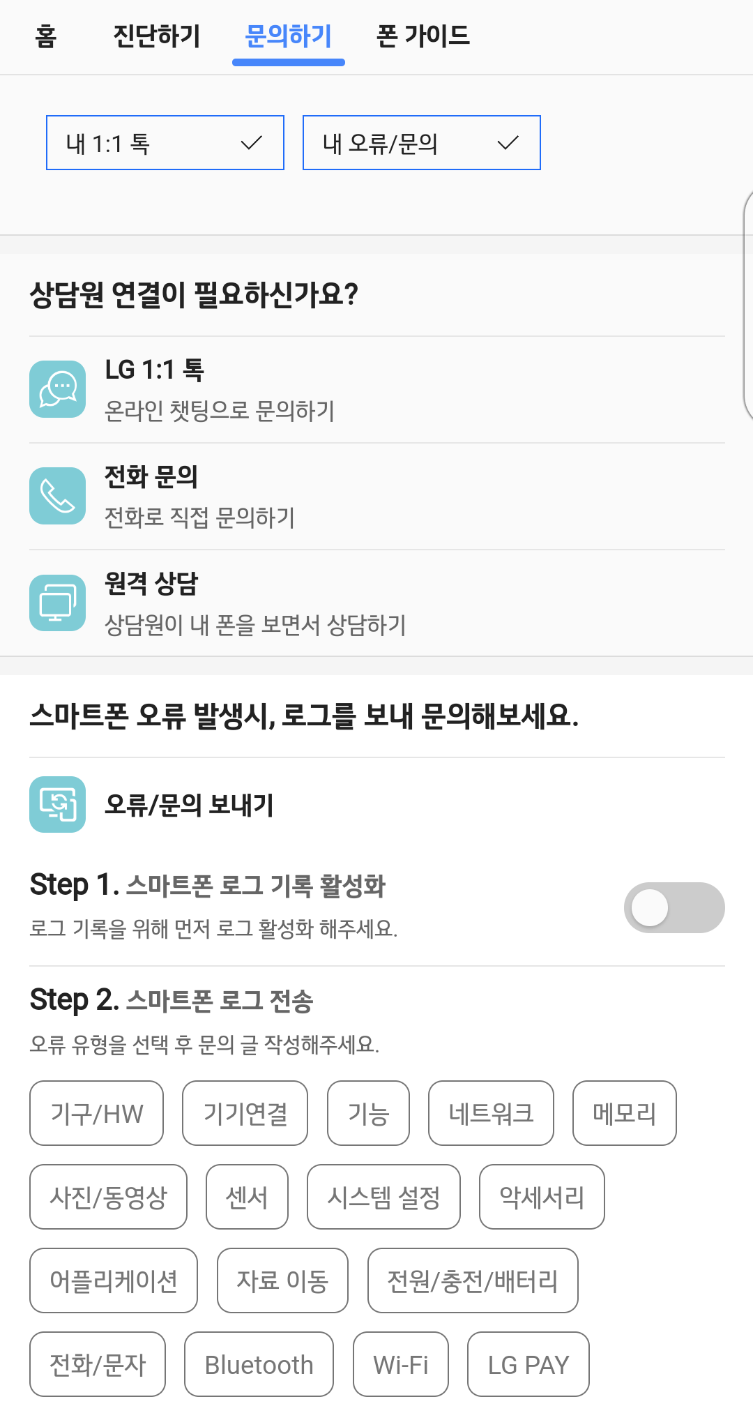 현재 LG전자 스마트폰의 로그 분석 기능은 두 앱을 통해서 가능합니다. 하나는 퀵 헬프, 나머지 하나는 LG전자 원격상담 앱니다.