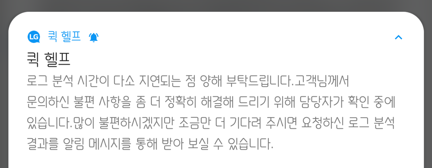 지난 글에서 안내할 때에는 별도로 알림이 울리지 않기 때문에 로그 전송 시 실패하지 않기 위해선 왔다갔다하며 상황을 확인할 필요가 있다고 언급한 적이 있었습니다. 하지만, 이 부분도 개선되면서 이제는 전송 완료, 담당자 선정, 로그 분석 지연 안내, 진단 결과 도착 등 대부분의 세세한 상황에서 알림을 보내줍니다. 다만, 로그 전송 완료 알림의 경우에는 퀵 헬프 앱을 벗어난 상태여야만 작동하며, 여전히 퀵 헬프 서비스 앱을 통해서 전송하므로 '최근 사용 앱' 목록에서 지우지 않는 것이 전송 실패 확률을 낮춰줍니다.