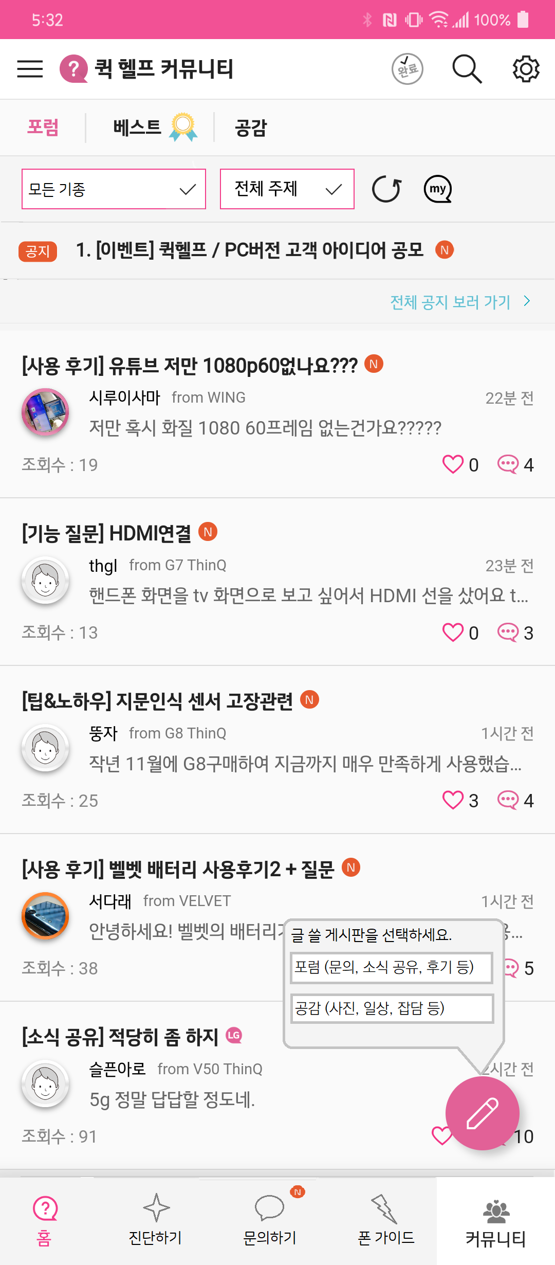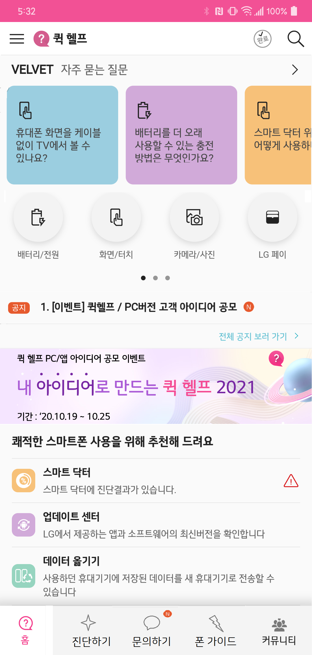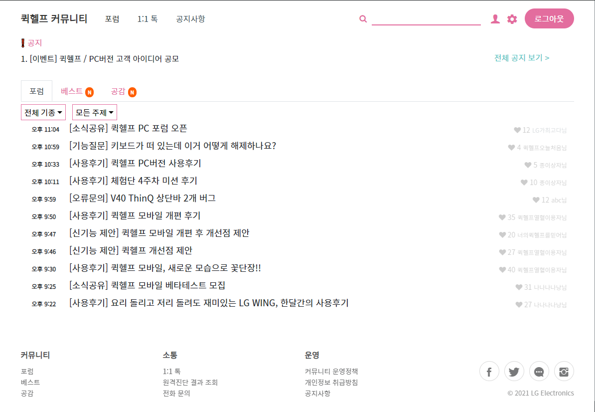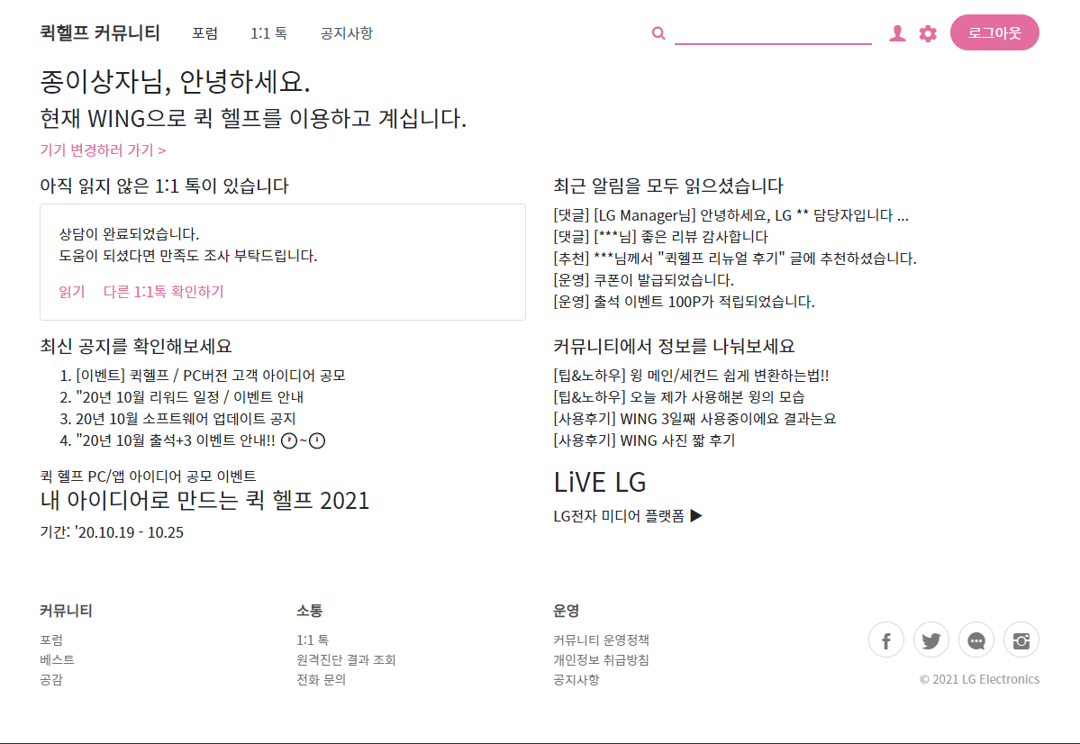 LG Fandom과는 크게 상관 없는 이벤트일지 모르지만, Fandom 활동 즈음에 퀵 헬프는 이벤트와 각종 서비스를 강화하면서 그 중 하나로 많은 분들이 염원했던 PC 버전 개발 및 모바일 개편, 퀵 헬프 탑재 기종 확대 등을 공지했었습니다. 이 과정에서 퀵 헬프 개편 아이디어 공모전이 열렸고, 저는 LG Fandom의 일원이라면 그 이름에 부끄럽지 않게 준비해야겠다는 생각으로 임했었습니다.