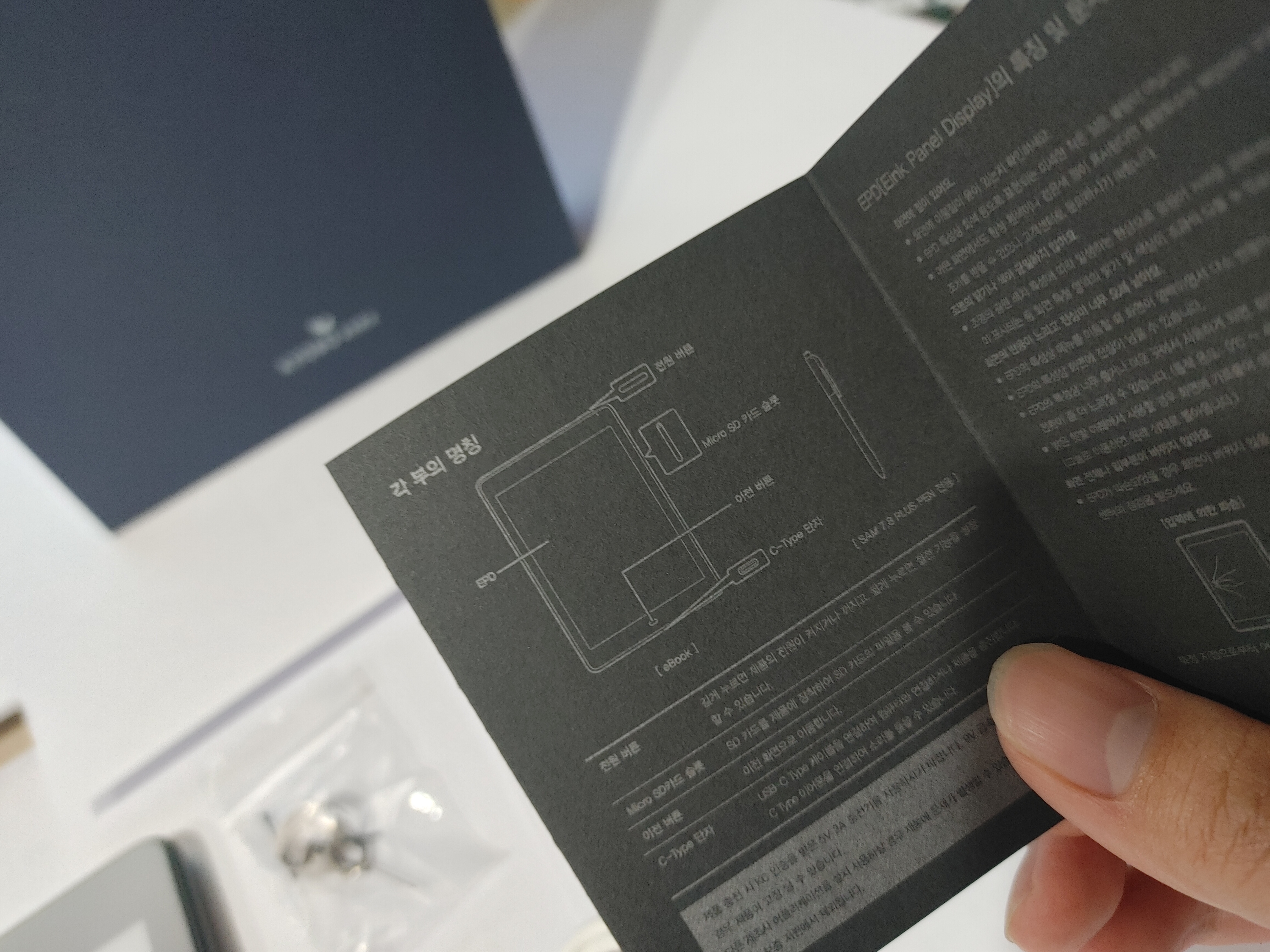 간단 가이드는 각 부위의 명칭과 EPD(E-Ink Panel Display)의 특징에 대해 설명하고 있습니다. 특이하게도 가운데 터치식 버튼이 홈 버튼이 아닌, 뒤로 가기 버튼입니다. 이때문에 초반에는 크레마 사운드업과 헷갈려 실수하기도 했습니다.