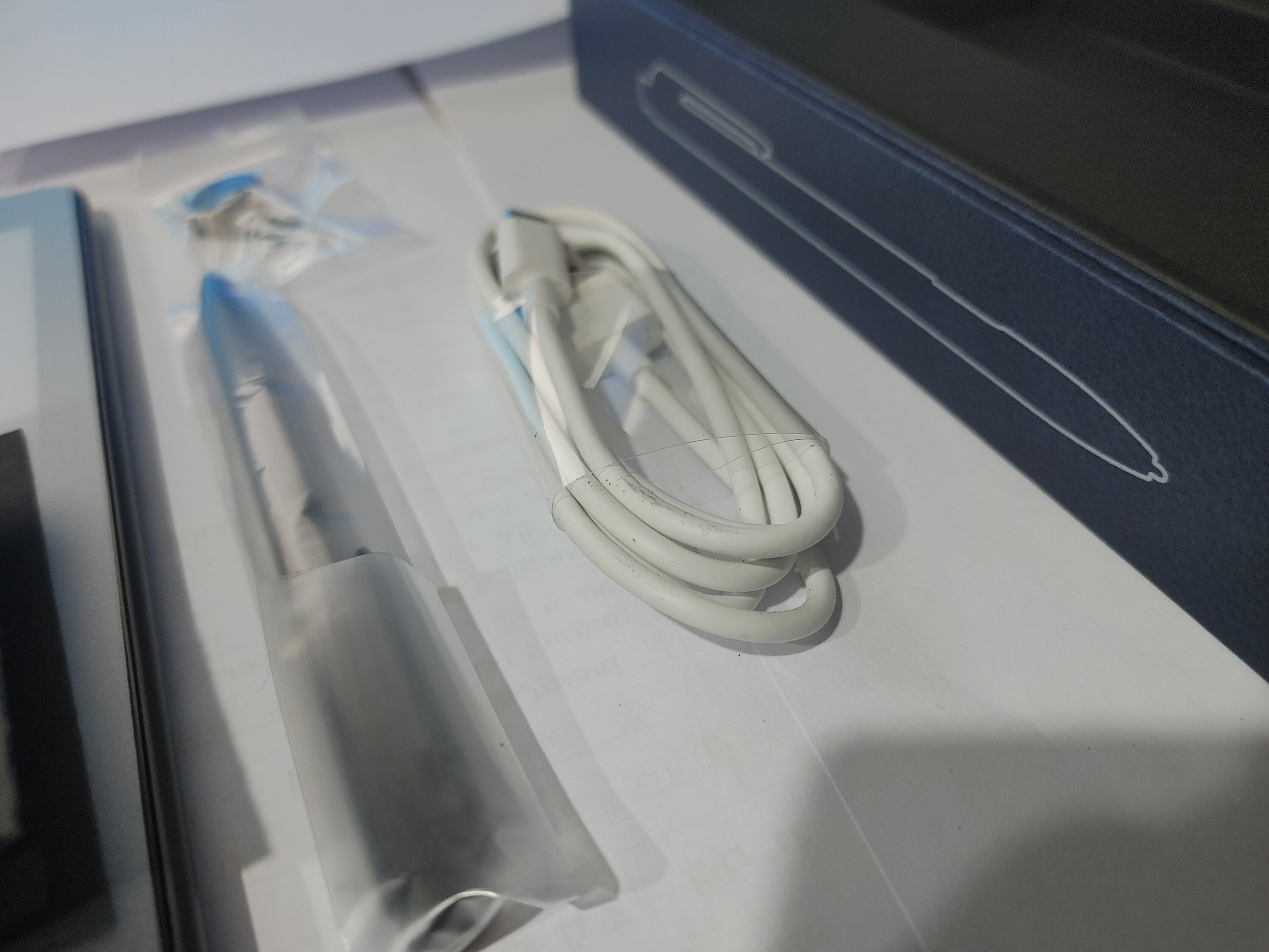 부속품은 펜을 인식하는 제품인 만큼 와콤 EMR 펜, 펜 팁 집게, 여분 펜 팁 2개, microSD 트레이를 위한 핀과 Type C 케이블로 구성되어 있습니다. 한 가지 실망한 점은, 검은색 종이 상자가 정확히 어떤 염료를 썼는지는 모르겠으나 부속품을 빼내는 과정에서 흰 케이블에 위 사진처럼 검은색 이물질이 묻어 나온다는 점입니다.