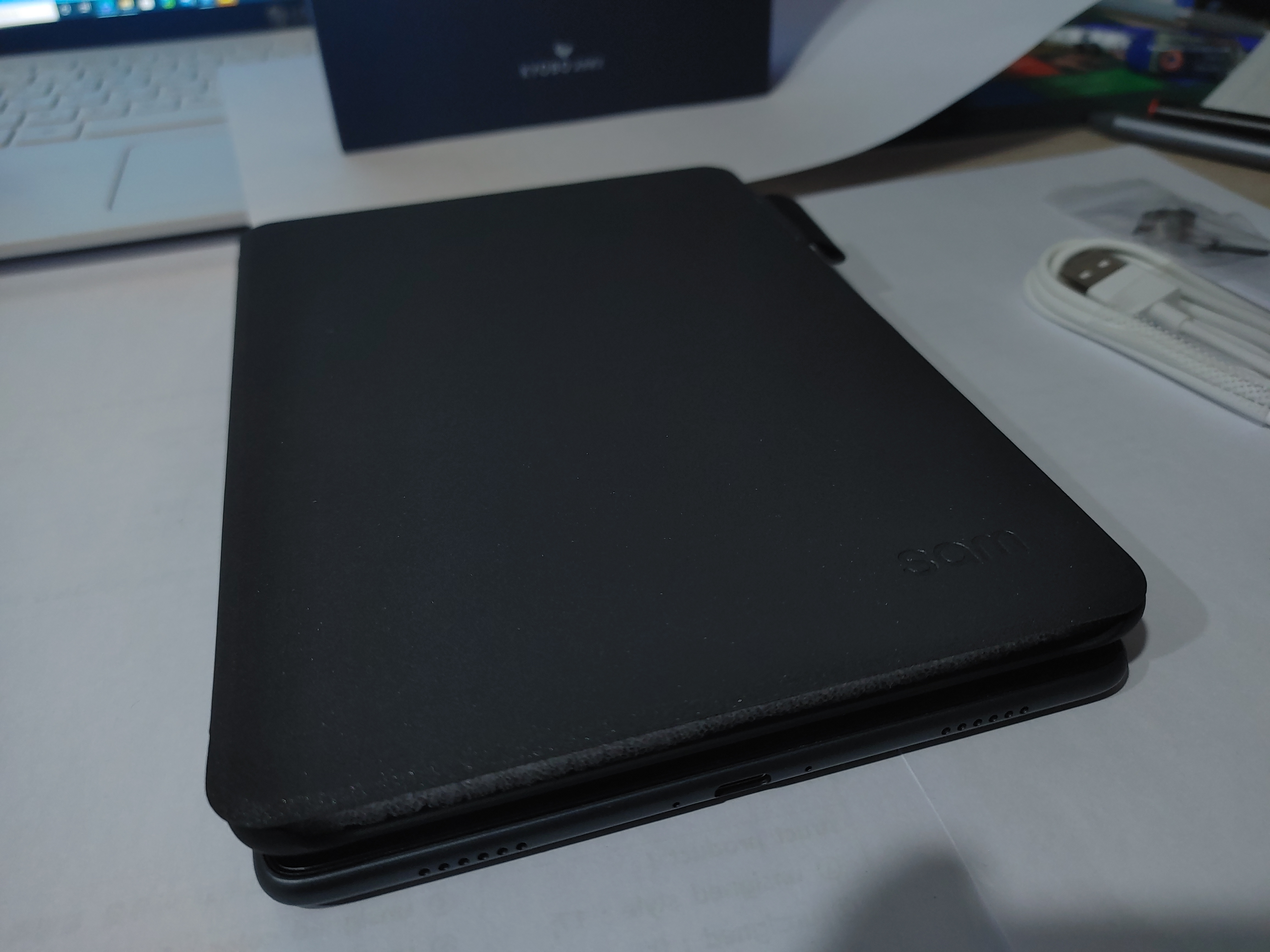 케이스를 장착하면 이런 모습이 됩니다. 오토-웨이크업을 지원하는 것이 특징인데, 교보문고에서 해당 옵션을 켜거나 끄는 설정을 넣지 않았기 때문에 장착하면 기본적으로 작동하도록 되어 있습니다. 인식 방법은 자석으로, 뒤로가기 버튼 즈음에 자석을 가져다 대면 케이스가 없어도 해당 기능이 동작하는 것을 확인하실 수 있습니다. 따라서 만약 케이스로 덮었는데 화면이 슬립 모드로 전환되지 않는다면 교환할 필요가 있습니다. 저의 경우에는 불량 여부를 5월에 인지하여 구입한지 6개월이 되기 직전에 교환한 바 있습니다.