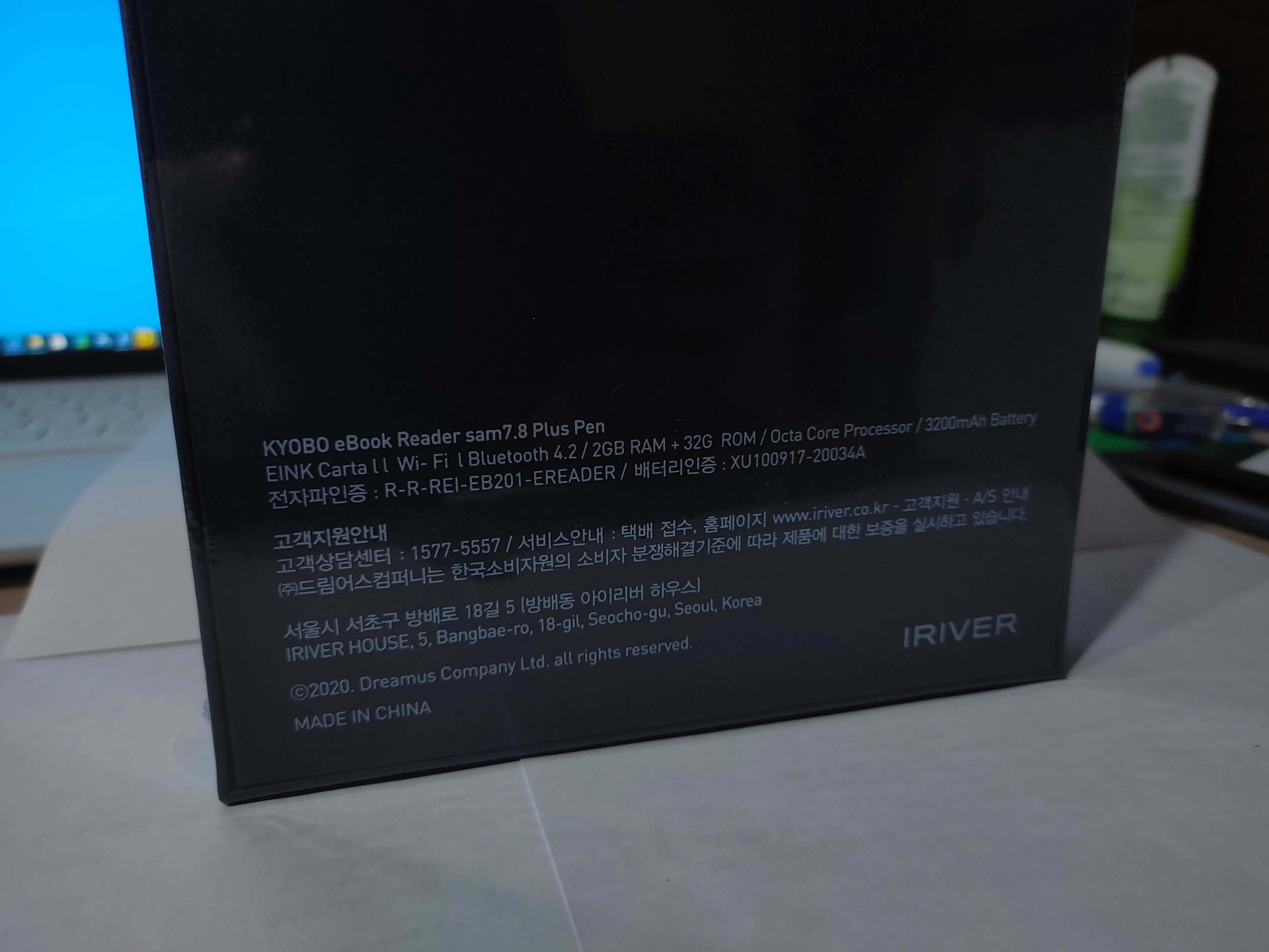 제품의 후면에는 각종 사양과 고객 지원 관련 내용이 담겨 있었습니다. 특이한 점은, 원 제조사(OEM)가 보위에이고 교보문고 리더기로 발매되는 기종임에도 불구하고 드림어스 컴패니[각주:1]의 주력 브랜드인 '아이리버'가 붙어있다는 점입니다.
