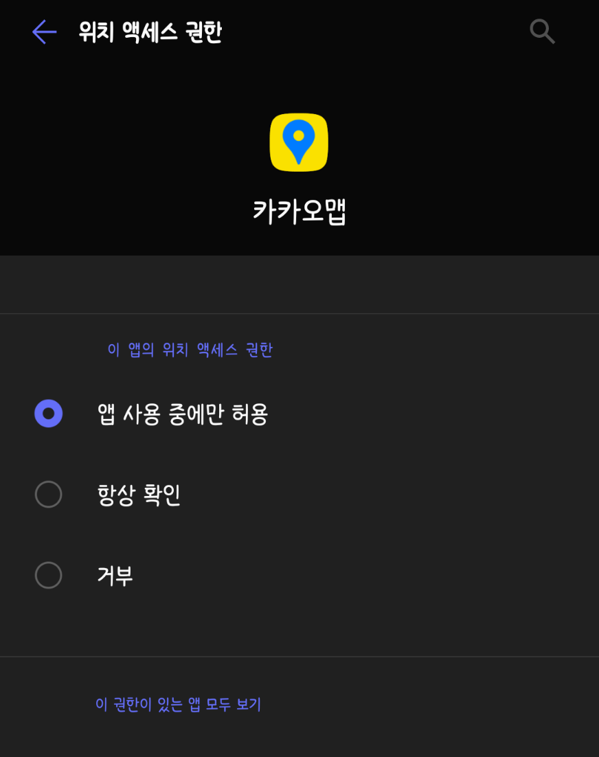 참고로 해당 기능은 알림창의 퀵 패널 부분에 나타난 초록색 배경의 아이콘을 누르면 현재 사용 중인 앱의 이름이 나타나고, 이를 누르면 권한 메뉴로 바로 이동하도록 되어 있습니다.