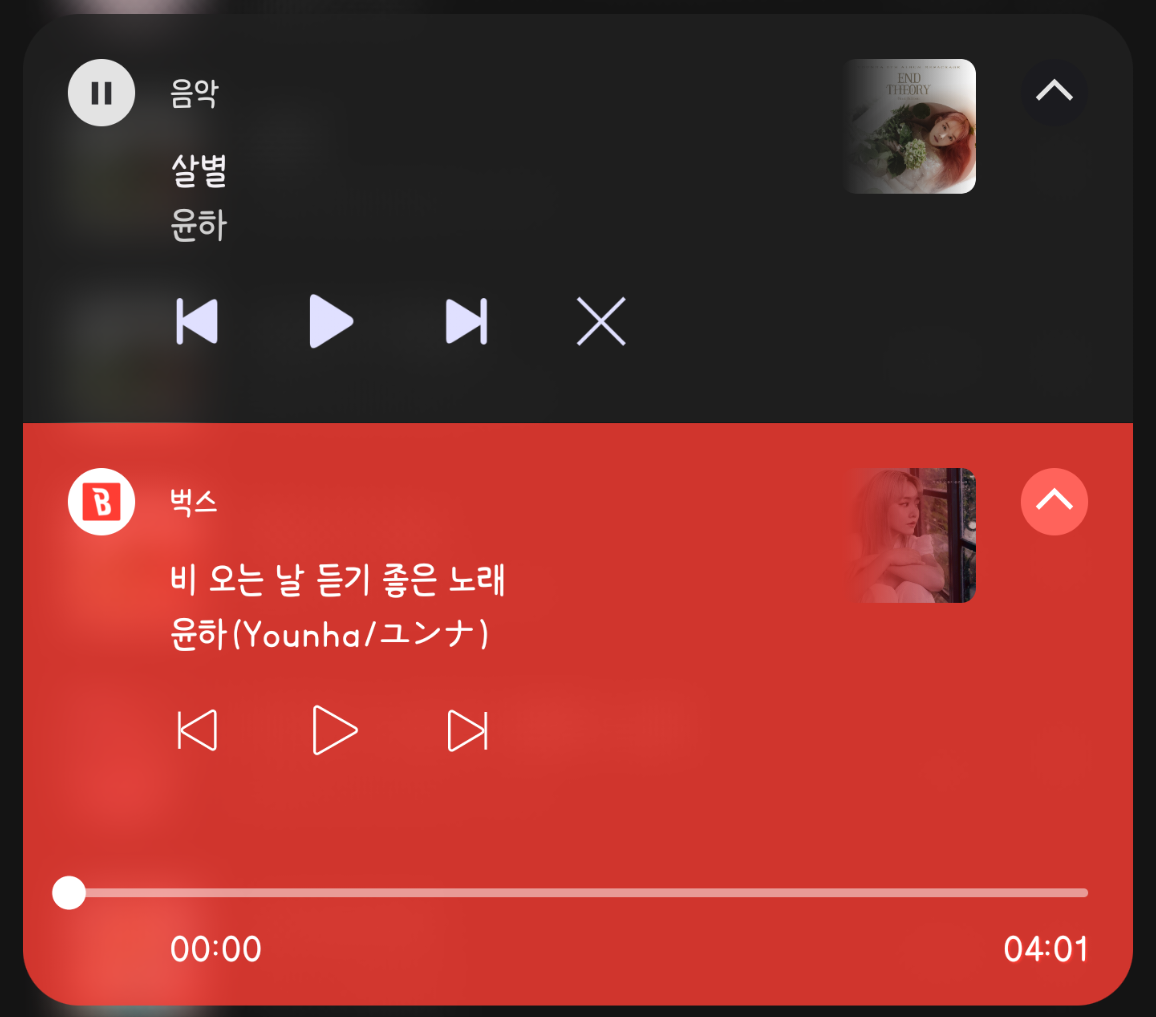 여전히 곡을 듣던 중 특정 시간으로 이동하는 기능은 제공하지 않지만, 이제 다른 음악 앱과 같이 실행해도 미디어 알림 부분에 함께 묶이긴 합니다. 다만, 안드로이드 11의 AOSP에 적용된 것처럼 좌우로 넘기며 보는 형태가 아닌, 알림 여러 개가 온 것처럼 표시되고 재생 기기 선택은 여전히 알림창을 한 번 더 쓸어내려서 하단에 표시된 재생 기기 선택 UI를 이용하는 식으로 적용되었습니다. 다만 이건 안드로이드 11과도 조금 다른 점으로, 안드로이드 11 당시에는 재생하지 않는 앱이 알림 란으로 이동하고 재생 중인 앱만 분리되는 형태였습니다. 그러나 현재는 재생 중이지 않아도 같은 미디어 알림으로 묶입니다.