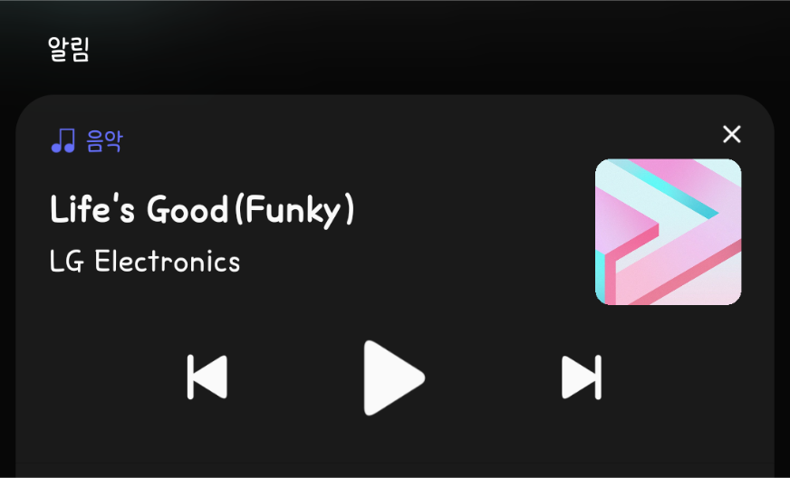 기존 LG 음악 앱은 알림이 안드로이드의 알림창 미디어 재생 관련 라이브러리를 적용하지 않는 것인지, 완전히 독자적인 UI로 구성되어 있었습니다. 미디어 재생 알림이 별도의 카테고리로 빠져나간 후에도 다른 앱과 달리 LG 음악 앱만 재생 중에도 알림 카테고리로 빠지는 등 다른 음악 앱과 비교했을 때 다소 이질적인 형태였습니다. WING UI 즈음하여 알림의 크기도 매우 커져 부담스러웠다가, 그나마 안드로이드 11에 들어서 가로 모드에 한해 알림 UI가 축소되는 것으로 변경되었는데 안드로이드 12부터는 자체 알림 UI를 포기하는 형태로 변화하였습니다.