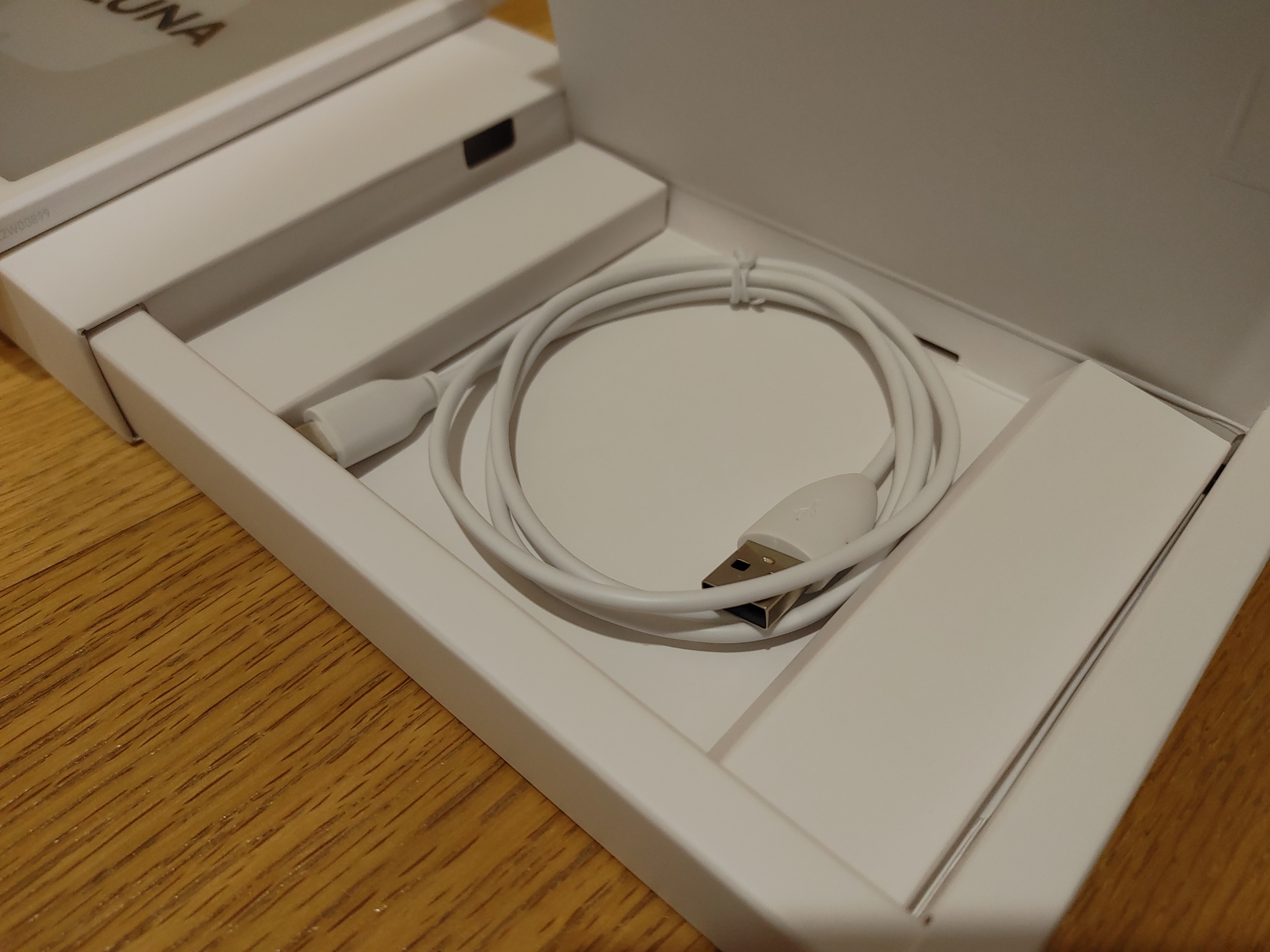 앞선 사진에서 보이는 바와 같이 상자 후면 파인 홈으로 잡아당겨 위에서 아래로 제품 상자를 개봉하는 형식이라 조금 독특했습니다. 동봉품은 크레마 사운드업과 비슷해서 본품, 사용설명서, USB Type A to Type C 케이블을 제공합니다. 과거와 달라진 점이라면 이제 USB 케이블이나 리더기를 비닐에 담아 제공하진 않는다는 점과, 하단에 잡아당겨서 본체를 꺼낼 수 있는 종이 손잡이가 있어서 비교적 개봉이 편한 점이 있겠네요.
