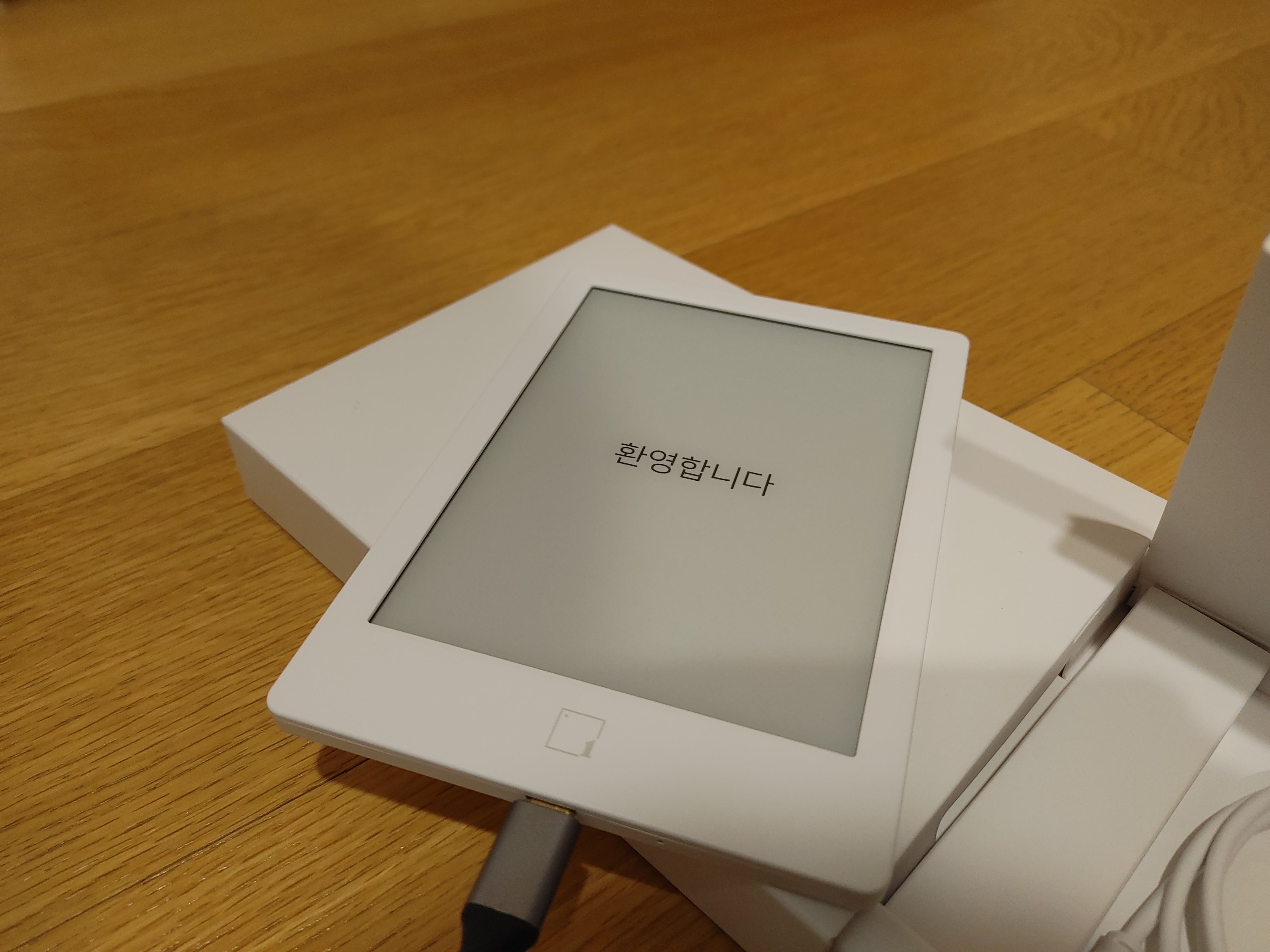 충전기에 꽂아보니 환영합니다, 라는 문구가 표시되는 것이 어딘가 Windows를 생각나게 합니다. 이후 설정 과정은 다른 리더기와 크게 다르진 않아 금방 설정할 수 있었습니다.