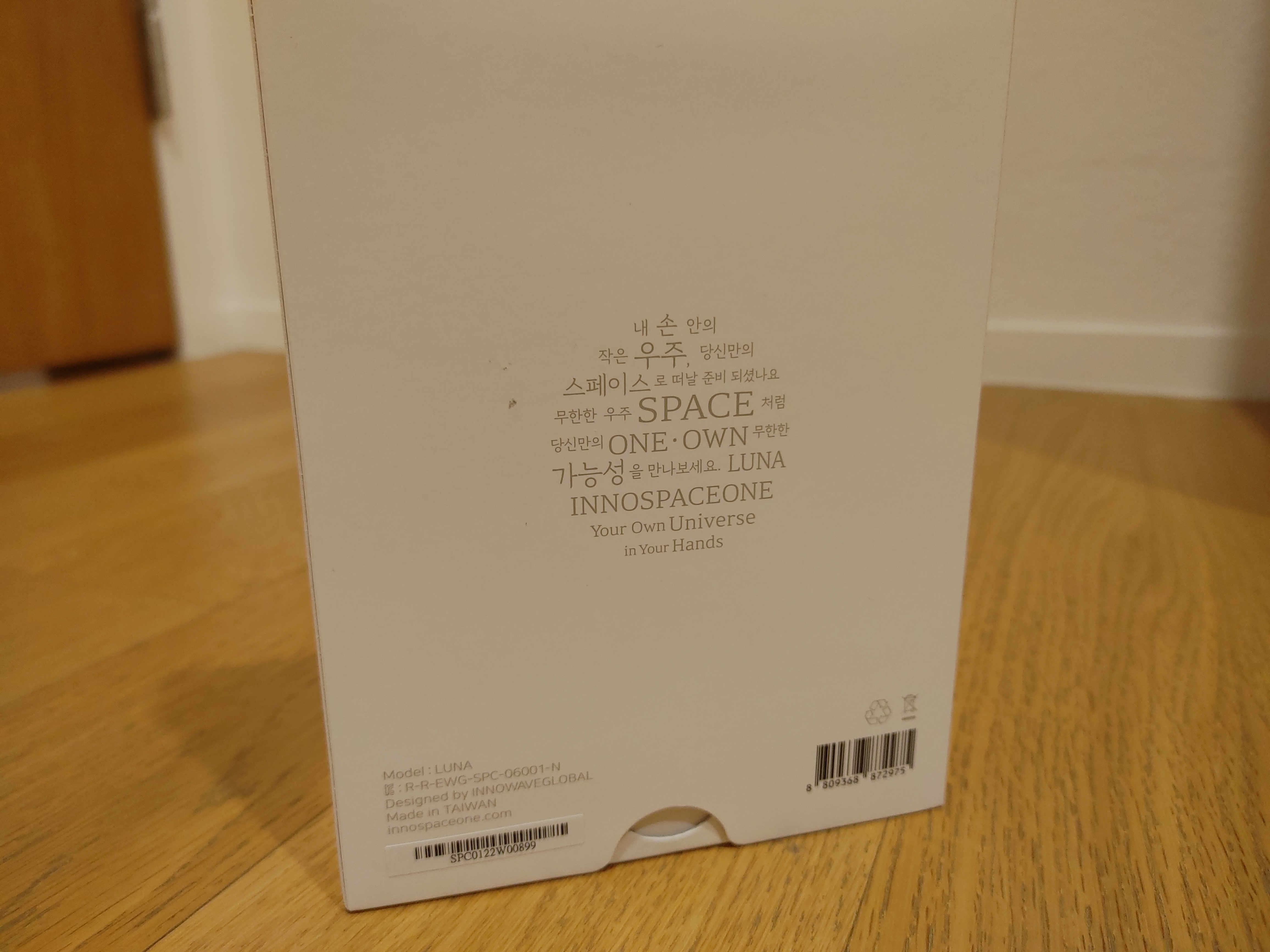 이노스페이스원 루나의 제품 상자는 상품 상세 페이지에 기재된 것처럼 LUNA 글씨가 양각된 흰 상자 형태입니다. 그래도 렌더링된 그림보단 실물이 비교적 나은 편이라 다행입니다. 시대가 시대인지라, 크레마 사운드업 시절보다는 제품 상자가 얇아진 것도 같습니다.