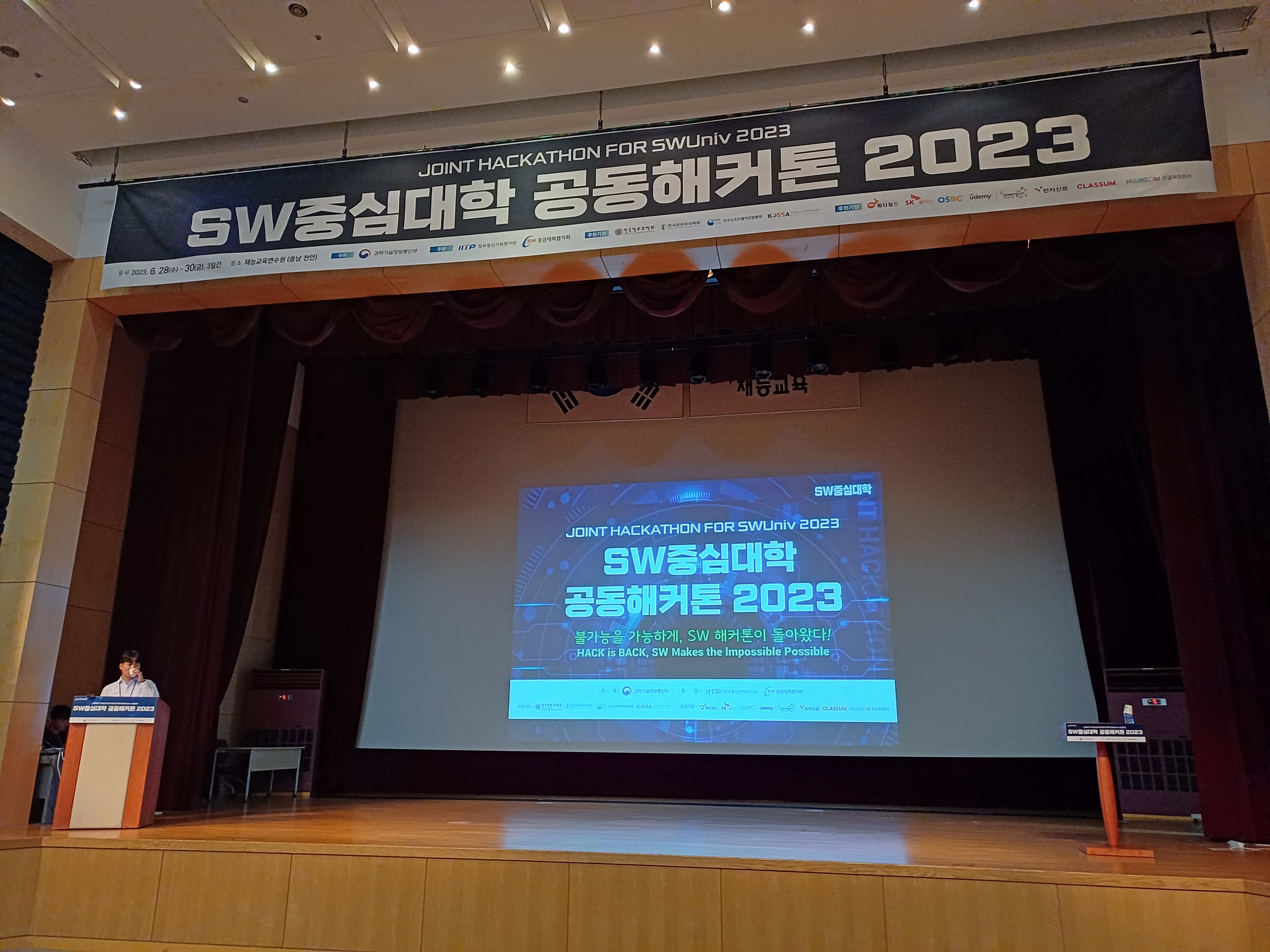 어찌어찌 도착하고 나서 앉은 옆자리는 우연히 같은 학교, 같은 학과 학생이었습니다. 심지어 나중에 알았지만 기숙사 룸메이트이기도 해서, 다행히 다니는 동안 편안하게 지낼 수 있었습니다. 다만 이와 별개로 아무래도 너무 빡빡하게 짜여진 일정으로 인해 자꾸 미뤄지는 과정이 불안에 불안을 낳았습니다. 여기서 해커톤을 하는 것은 아니라고 했지만 벌써부터 대강당의 인터넷은 느리고, 개회사에서도 일정 문제로 협의회장님께서 온라인으로 참석하시는 등 오랜만에 오프라인으로 개최된 점이 여러 혼란을 낳는 듯 했습니다.