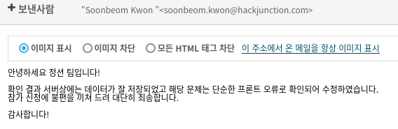 발표 자료는 예정 시간보다 상당히 여유있게 제출할 수 있었고, 기획자 분께서 미국에서 오신 덕에 발표를 상당히 매끄럽게 감당해주셨습니다. 심사위원 분들께서는 질문을 거의 던지지 않으셨는데, 시연이 가능한지 여부를 확인하시고는 다음 팀으로 넘어가셔서 저희를 잔뜩 긴장케 했습니다. 저는 지난 공동 해커톤에서 질문이 하나도 나오지 않은 채 끝장이 난 경험을 맞이한 직후였고, 다음 팀에서는 이런저런 질문을 던지시느라 많은 시간을 쓰셨기 때문에 비관적인 예측이 팀 내에 자리잡았습니다. 그런데,