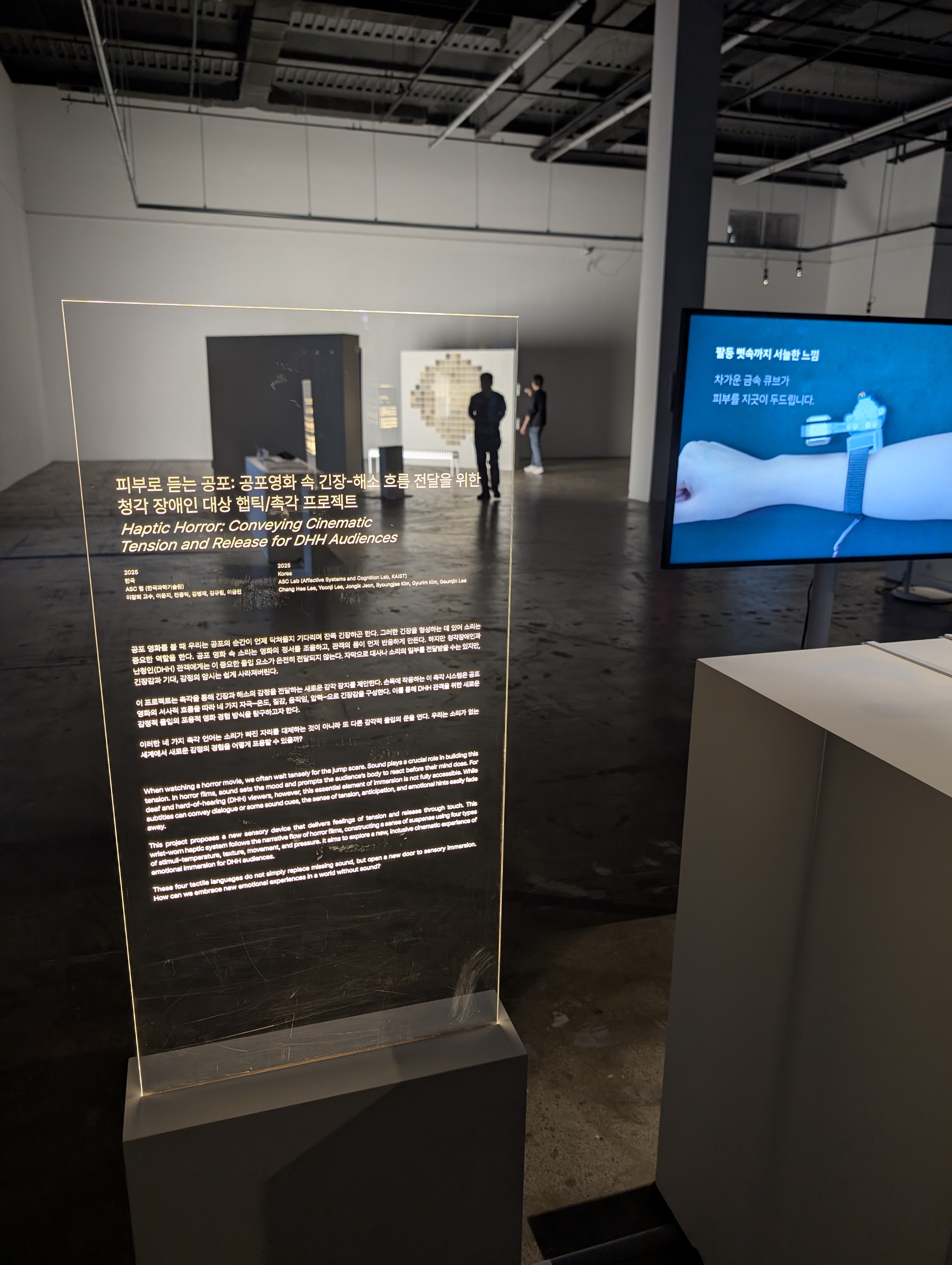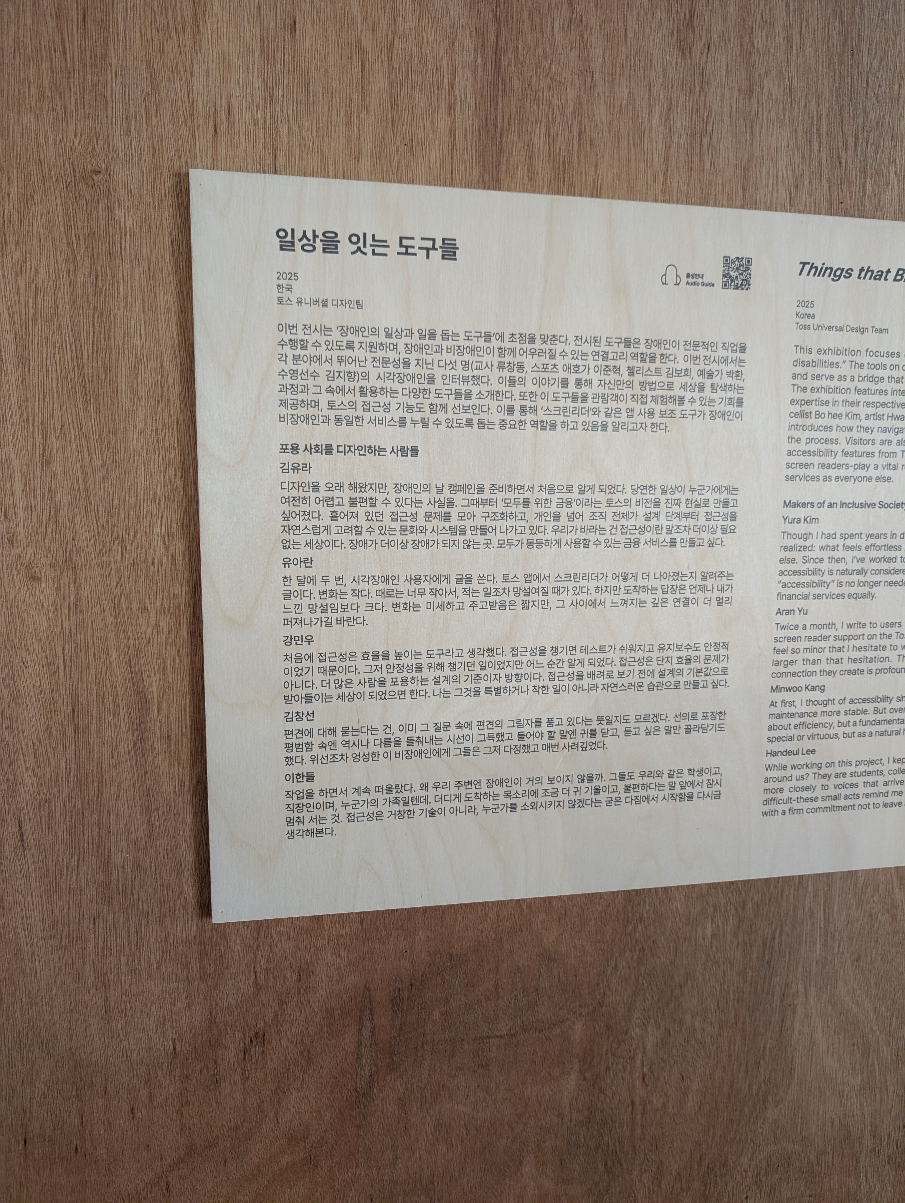 하나만 더, 주최 측에 아쉬움이 있다면 몇몇 전시물은 가까이 갈 수 없는데 글자 크기가 작아 안경을 챙겨갔음에도 설명을 제대로 읽기 힘들었습니다. 마지막 전시관에서는 설명판에 투명 아크릴을 이용해서 더욱 가독성이 나빴습니다. 홈페이지 메인 이미지에 대체 텍스트도 없었고요. 포용 디자인과 접근성을 소재로 한 전시였으니, 조금 더 신경을 써 주었으면 좋았을 것 같아요.