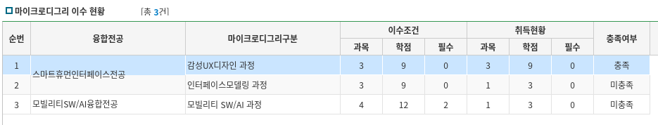 대신하여 UX디자인을 고려했을 때에는 디자인학과 과목으로서 선수과목의 벽에 부딪혀 계획적인 교과목 설계가 필요했습니다.