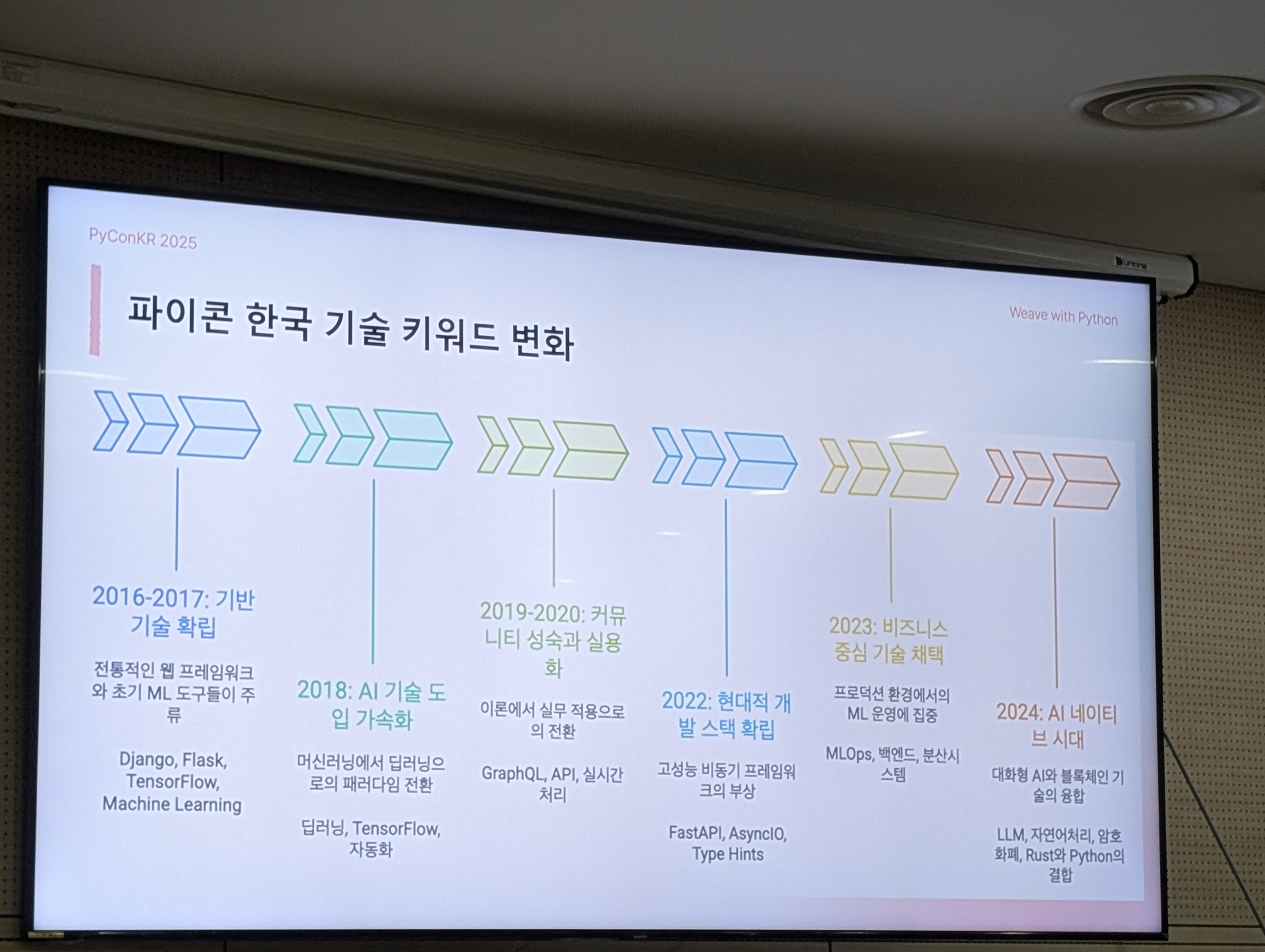 계절학기가 마무리될 무렵에는 작년에 이어 소속된 우분투한국커뮤니티에서 UbuCon Korea 준비를 함께 하였고, 올해는 드디어 빠르게 매진되어 왔던 FEConf의 자원 봉사자에 선발되어[각주:2] 참가자 QR 인증을 돕거나 잃어버린 물건을 찾아 드리는 등 보람있는 경험을 했습니다. 또 PyCon Korea 2025에는 커뮤니티 후원사 자격으로 참가하기도 하였는데, 이처럼 개발자 컨퍼런스를 많이 간 해도 없었을 거라 생각합니다. 예전에는 그간 몰랐던 지식을, 또는 공부하기 위한 키워드를 얻으러 갔었는데, 이때는 그보단 네트워킹이 더 많은 비중을 가져갔으니 어떻게 보면 조금은 성장했나, 싶은 마음에 뿌듯하기도 했던 것 같습니다.
